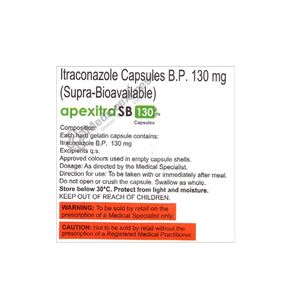 Apexitra Sb 130 mg Cap 10'S, is used to treat fungal infections of the mouth, throat, toenails, fingernails, or lungs. A fungus assaults the tissue and causes infection in a fungus infection. It is possible for fungus infections to spread (spread from one person to another).Disclaimer:For more information contact your physician.