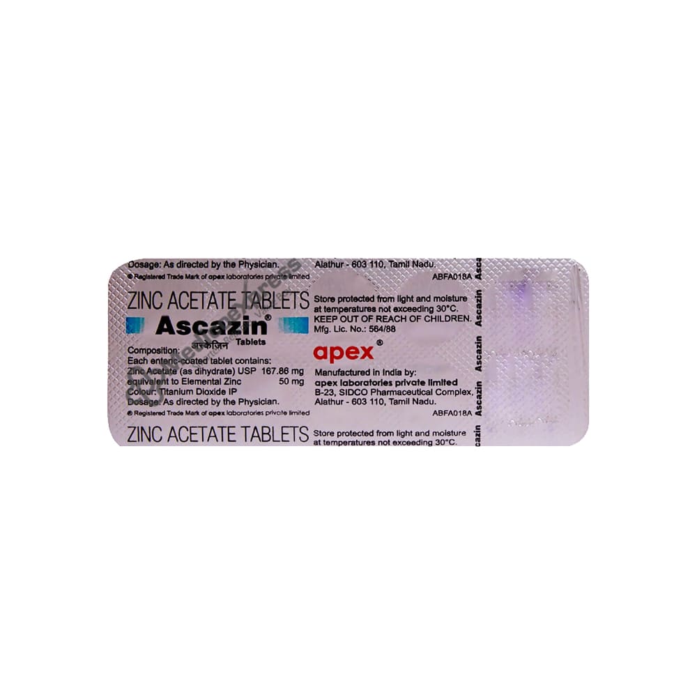 Ascazin Tablets, 10 are a type of medication referred to as a mineral supplement that is used to treat and prevent zinc deficiency. When the body does not absorb or obtain enough minerals from meals, a mineral deficit develops. Minerals are essential for healthy body growth and illness prevention.Disclaimer:For more information contact your physician.