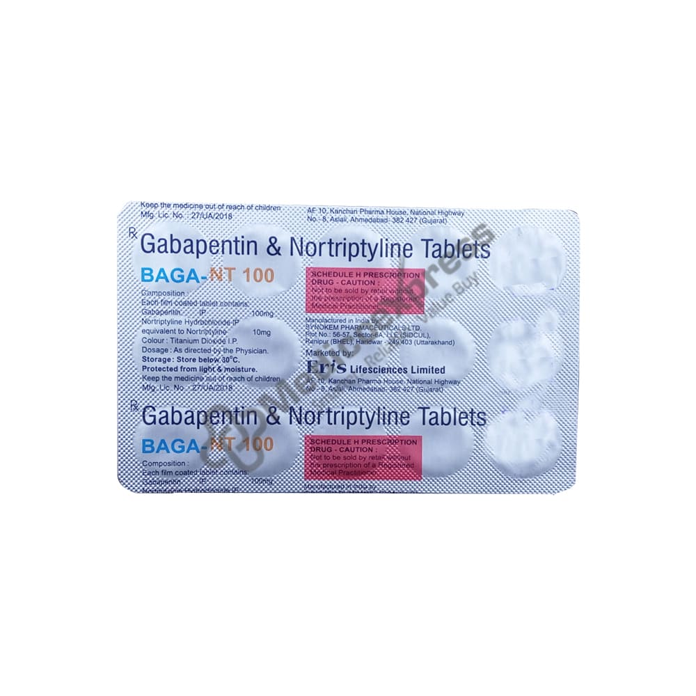 Baga-nt 100/10mg tablet 15's is an anticonvulsant (gabapentin) and antidepressant (nortriptyline) combination medication used to treat neuropathic pain.Disclaimer:For more information contact your physician