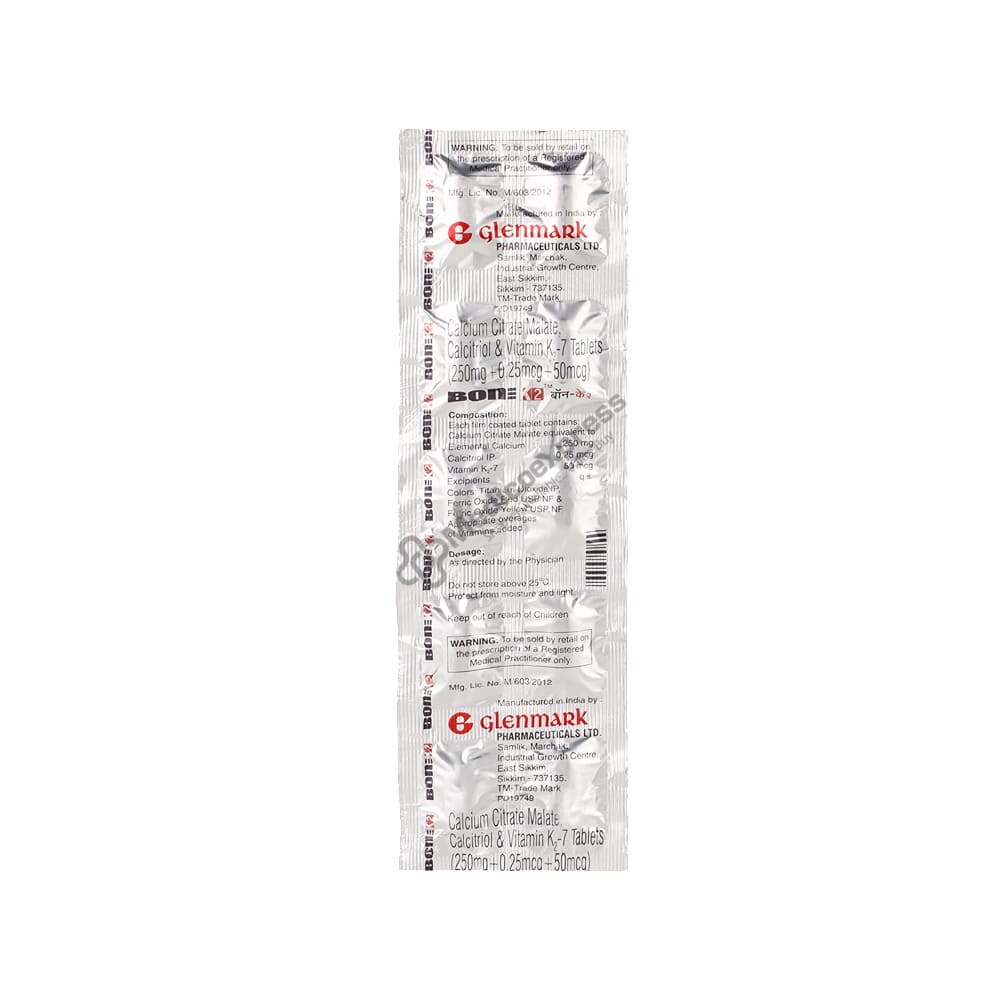 Bon k2 is a bone health dietary supplement. Its active ingredients are a combination of calcium carbonate, vitamin d, and vitamin k2. It promotes bone health by strengthening bones and improving and maintaining bone mineral density (bmd).Disclaimer:For more information contact your physician
