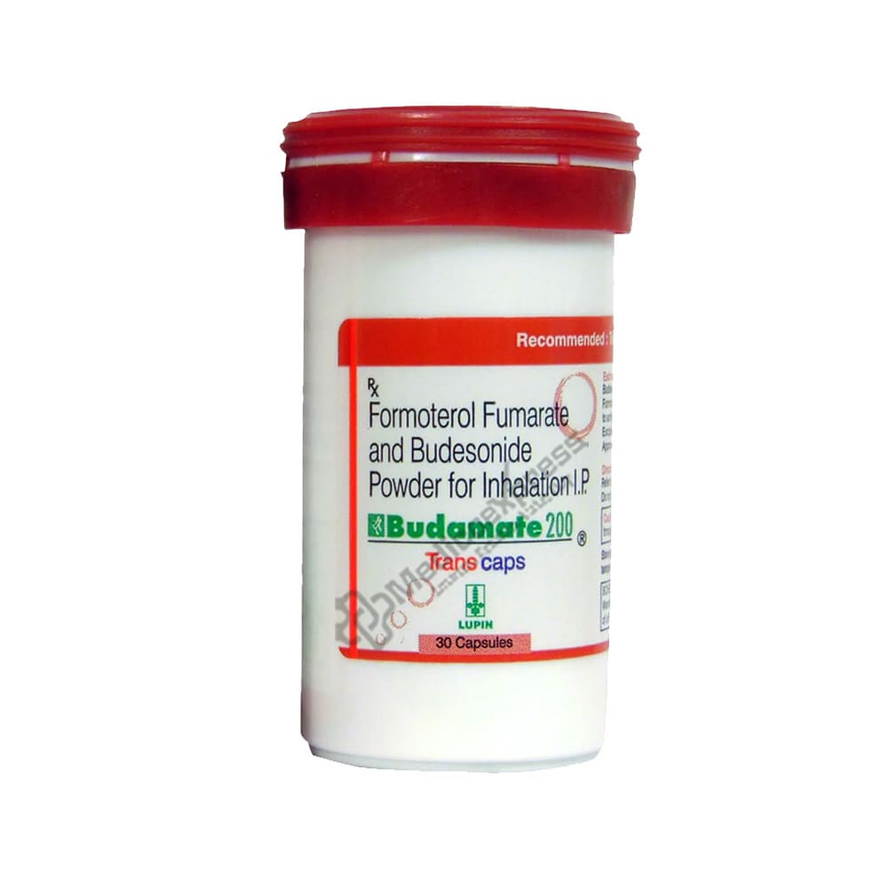 Budamate 200 Transcaps 30's is primarily used to treat the signs and symptoms of COPD and asthma (COPD). A chronic (long-term) respiratory illness called asthma causes the airways to constrict, swell, and generate excess mucus, which makes breathing difficult. Emphysema (breathlessness) and chronic bronchitis are two of the lung disorders that make up COPD (inflammation of the lining of bronchial tubes). The medication Budamate 200 Transcaps 30's combines the corticosteroid Budesonide with the formoterol (LABA - long-acting beta-agonists or bronchodilator). Budesonide is a member of the corticosteroid class, which reduces inflammation and swelling by working inside the cells lining the nasal tube and the airways and halting the production of certain molecules that cause allergic reactions and inflammatory reactions.Disclaimer:For more information contact your physician.