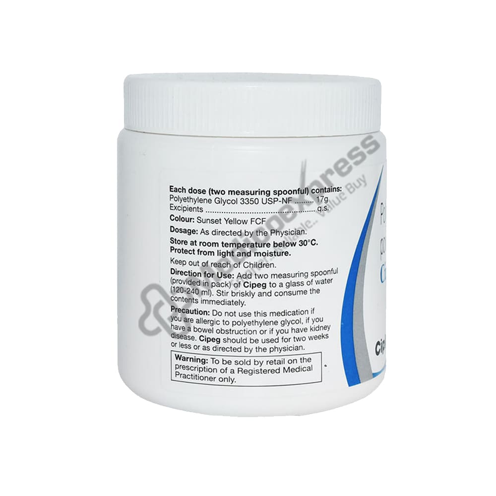 Cipeg Powder is an oral solution powder that contains Polyethylene glycol (PEG) 3350, an osmotic agent that causes water retention in the stool, resulting in softer stool and more frequent bowel movements. It appears to have no effect on active glucose or electrolyte absorption or secretion.Disclaimer:For More Information Contact Your Physician