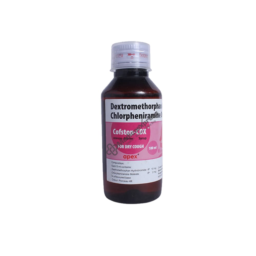 Cofstop-CDX Syrup 100 ml is a member of the group of drugs known as "cough and cold preparations," which are generally used to treat dry cough. Dry or productive coughing is the body's method of removing irritants from the airways and guarding against infection, such as allergies, mucus, or smoke. Coughs come in two different varieties. Chesty and dry coughing. A chesty cough (wet cough) is characterised by the production of mucous or phlegm to aid in clearing your airways, whereas a dry cough is ticklish and does not create any nasty or thick mucus.Disclaimer:For more information contact your physician.