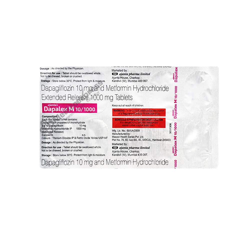 DAPALEX M 10/1000 TABLET is a combination of Dapagliflozin and Metformin, both of which are anti-diabetic medications. It is used to treat type 2 diabetes mellitus in conjunction with diet and exercise when other medications have failed to control the disease. It is also used in conjunction with liraglutide, an insulin or GLP-1 receptor agonist.Disclaimer:For More Information Contact Your Physician