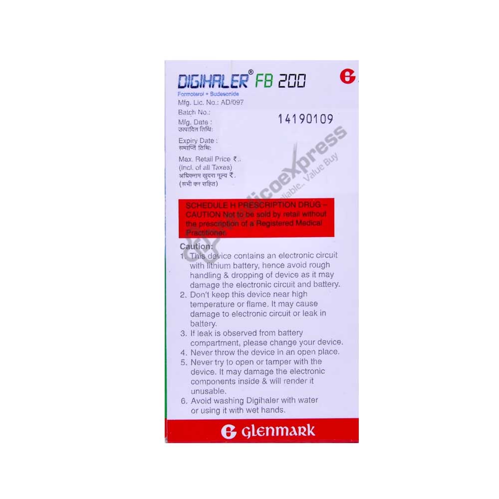 Digihaler FB 200 Inhaler is primarily used to treat the symptoms of chronic obstructive pulmonary disease and asthma (COPD). A chronic (long-term) respiratory illness called asthma causes the airways to constrict, swell, and generate excess mucus, which makes breathing difficult. Emphysema (breathlessness) and chronic bronchitis are two of the lung disorders that make up COPD (inflammation of the lining of bronchial tubes).A combination of two medications called Digihaler FB 200 Inhaler includes the corticosteroid Budesonide and the formoterol (LABA - long-acting beta-agonists or bronchodilator). Budesonide is a member of the corticosteroid class, which reduces inflammation and swelling by working inside the cells lining the nasal tube and the airways and halting the production of certain molecules that cause allergic reactions and inflammatory reactions.Disclaimer:For more information contact your physician.