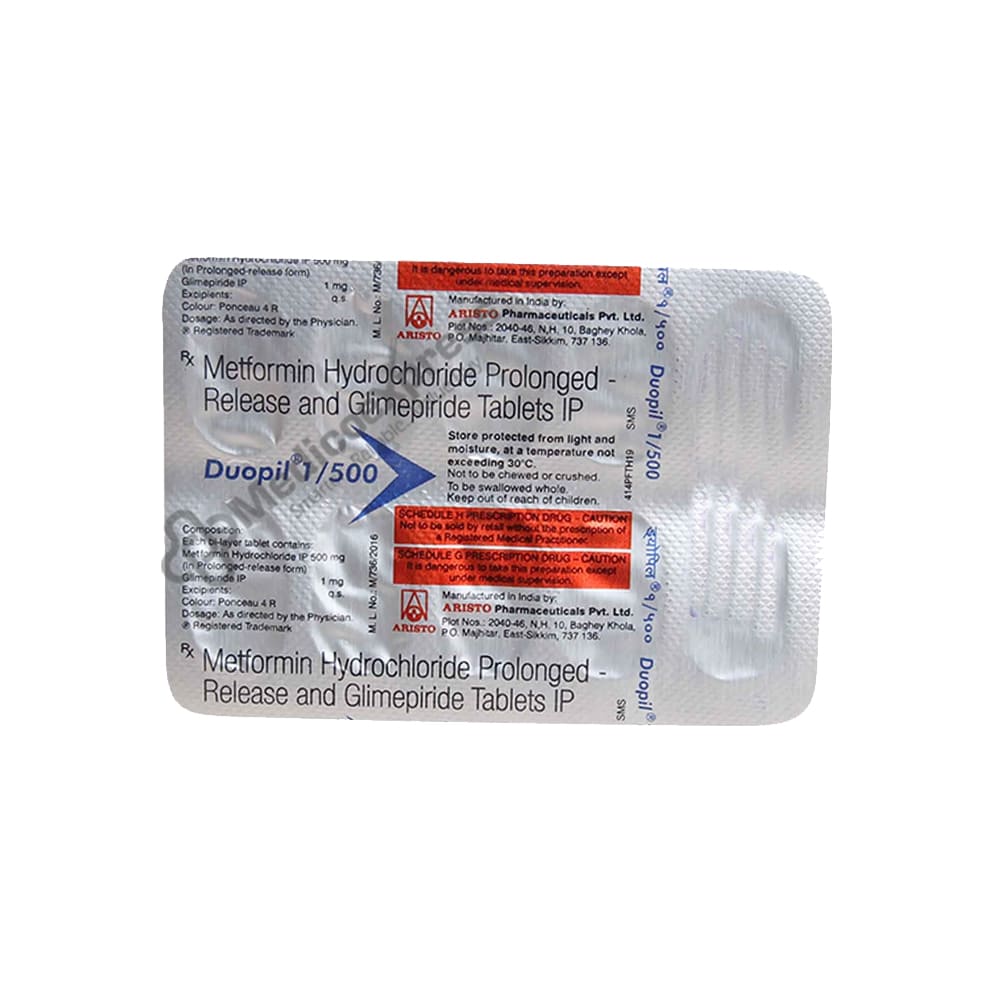 Duopil 1/500 Tablet 10's is an anti-diabetic medication used to treat type 2 diabetes, particularly in patients whose blood sugar levels are not controlled by diet and exercise alone. Type 2 diabetes is a long-term condition that affects how our bodies process glucose. Type 2 diabetes patients either do not produce enough insulin or the insulin they do produce is unable to perform its function in the body (insulin resistance).Disclaimer:For More Information Contact Your Physician