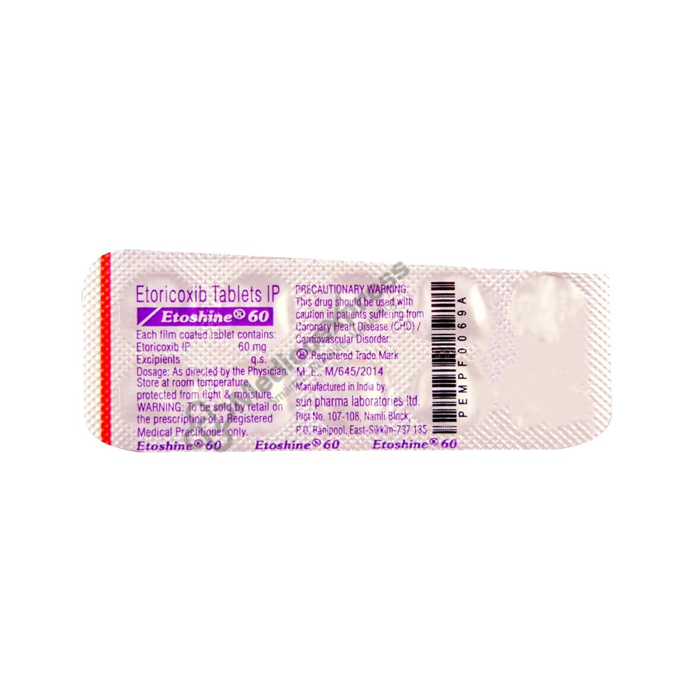 Etoshine 60 Tablet 10's Belongs To a Class Of Pharmaceuticals Known As Nsaids, Which Are Used To Treat Pain, Swelling, And Inflammation In Persons Over The Age Of 16 Who Have Osteoarthritis, Rheumatoid Arthritis, Ankylosing Spondylitis, Or Gout.Disclaimer:For More Information Contact Your Physician