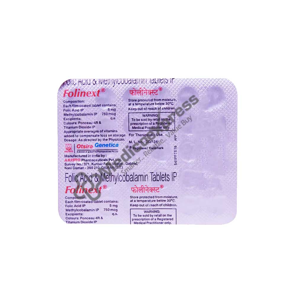 Folinext Tablet 30's is a member of the group of "multivitamins" that are primarily used to treat nutritional deficiencies brought on by various side effects or chronic illness. It is used to treat and prevent neurological conditions like peripheral neuropathy (nerve disorder), seizures, and folate deficiency. Anaemia is a condition in which there are not enough red blood cells (fits).Disclaimer : For More Details, Contact Your Physician