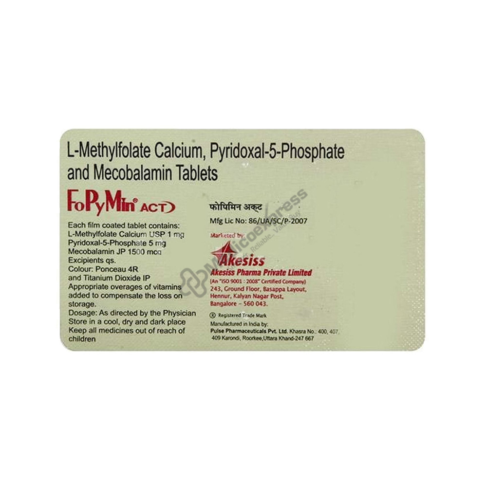 Fopymin Act Tablet 10'S contains L-Methylfolate, Pyridoxine, and Methylcobalamin.Disclaimer:For More Information Contact Your Physician