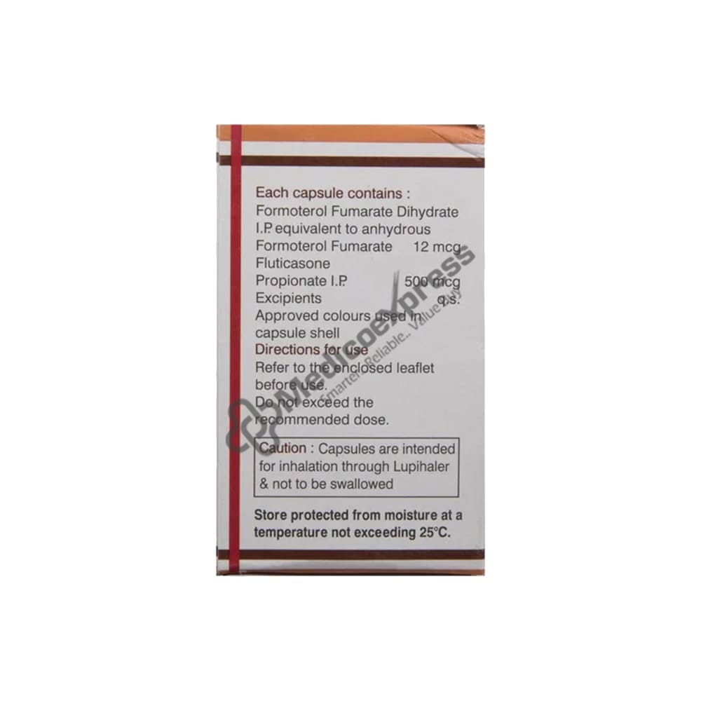 Formoflo Forte Transcaps 30's is generally used to treat and prevent asthma as well as COPD conditions like bronchitis, which is an inflammation of the lining of your bronchial tubes, and emphysema (shortness of breath). Asthma is a chronic (long-term) respiratory disorder in which the airways become constricted, swollen, and overflow with excess mucus, making breathing difficult. A collection of lung conditions known as COPD result in blocked lung airflow. Formoterol (a bronchodilator) and Fluticasone are the two medications included in Formoflo Forte Transcaps 30's (corticosteroids). When the muscles in the airways are relaxed, formoterol, a long-acting beta-agonist, increases airflow to the lungs. Formoterol facilitates breathing by enlarging the airways.Disclaimer:For more information contact your physician.