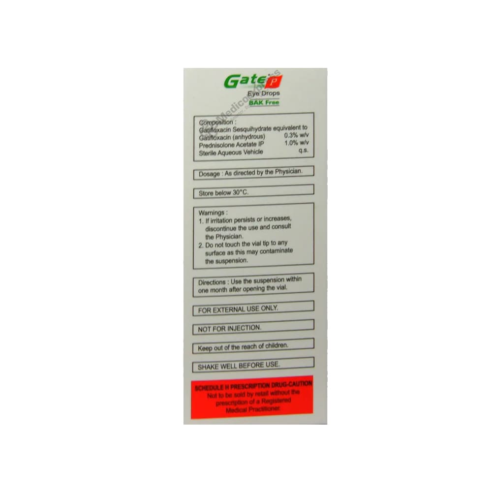 Gate P Eye Drop 10 ml is a medication in the 'Antibiotics and Corticosteroids' class that is used to treat bacterial eye infections or eye discomfort, particularly in patients who have had eye surgery. It also reduces the risk of postoperative eye infections such as conjunctivitis (inflammation of the conjunctiva) and other inflammatory conditions of the eye (cornea, iris, and connective tissue).Disclaimer:For More Information Contact Your Physician