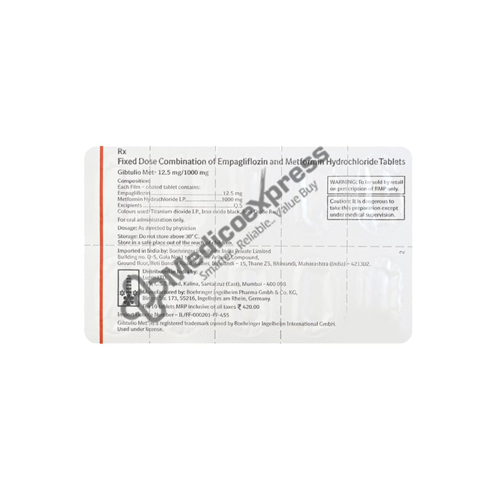 Gibtulio Met 12.5mg/1000mg Tablet 10's aids in blood sugar regulation. When combined with diet and exercise, this medication helps persons with type 2 diabetes mellitus better control their blood sugar levels. It aids in appropriate insulin utilisation, which lowers blood sugar levels. Regardless of the time of day, Gibtulio Met 12.5mg/1000mg Tablets should be taken with food, although you should attempt to take them at the same time each day. Your doctor will choose the dosage. Don't stop taking it before consulting your physician. If you do, your blood sugar levels might rise and you'd be more likely to get severe side effects including kidney damage or blindness.Disclaimer:For more information contact your physician.