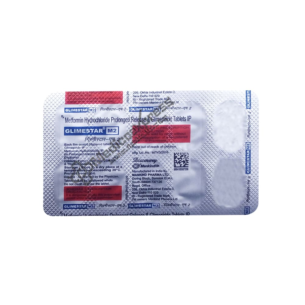 Glimestar-M2 Tablet 10 is a member of the anti-diabetic drug class of medications used to treat type 2 diabetes, particularly in people whose blood sugar levels are not under control via diet and exercise alone. Type 2 diabetes affects how our bodies metabolise glucose and is a chronic (long-lasting) disorder. In people with type 2 diabetes, the amount of insulin produced is either insufficient or the insulin cannot work properly in the body (insulin resistance). Glimepiride and metformin are the two anti-diabetic medications included in Glimestar-M2 Tablet 10's. The way glimepiride works is by activating the pancreatic beta cells that make insulin. As a result, insulin aids in the elimination of blood sugar. Metformin PR is a prolonged-release medication that disperses the medication over a longer period of time.Disclaimer:For more information contact your physician.