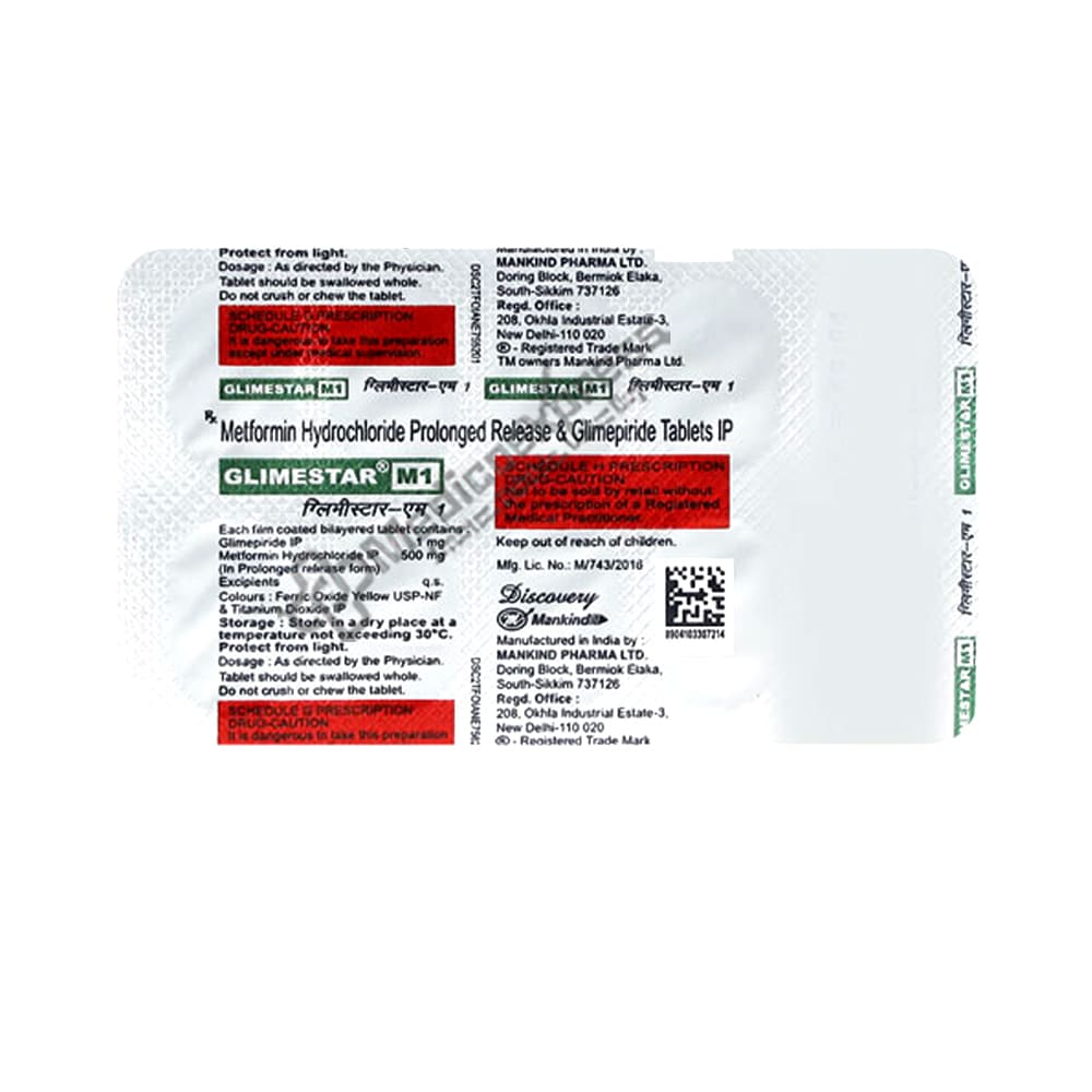 Glimestar-M1 Tablet 10 is a member of the anti-diabetic drug class of medications used to treat type 2 diabetes, particularly in people whose blood sugar levels are not under control via diet and exercise alone. Type 2 diabetes affects how our bodies metabolise glucose and is a chronic (long-lasting) disorder. In people with type 2 diabetes, the amount of insulin produced is either insufficient or the insulin cannot work properly in the body (insulin resistance). Glimepiride and metformin are the two anti-diabetic medications included in Glimestar-M1 Tablet 10's. The way glimepiride works is by activating the pancreatic beta cells that make insulin. As a result, insulin aids in the elimination of blood sugar. Metformin PR is a prolonged-release medication that disperses the medication over a longer period of time.Disclaimer:For more information contact your physician.