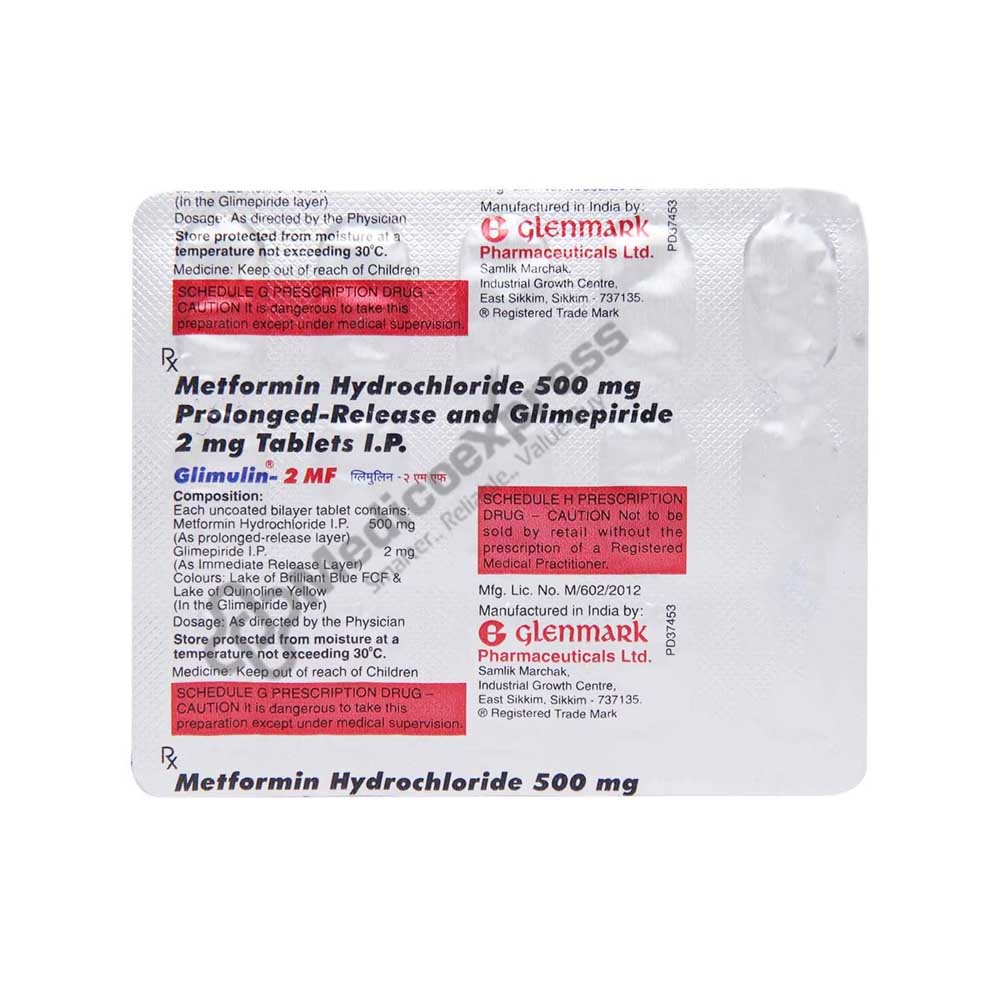 Glimulin-2MF Tablet 15s are a member of the anti-diabetic drug class of medications used to treat type 2 diabetes, particularly in people whose blood sugar levels are not under control via diet and exercise alone. Type 2 diabetes affects how our bodies process glucose and is a chronic (long-lasting) condition. In people with type 2 diabetes, the amount of insulin produced is either insufficient or the insulin cannot work properly in the body (insulin resistance). Glimepiride and metformin are the two anti-diabetic medications included in Glimulin-2MF Tablet 15's. The way glimepiride works is by activating the pancreatic beta cells that make insulin. As a result, insulin aids in the elimination of blood sugar. Metformin PR is a prolonged-release medication that disperses the medication over a longer period of time.Disclaimer:For more information contact your physician.