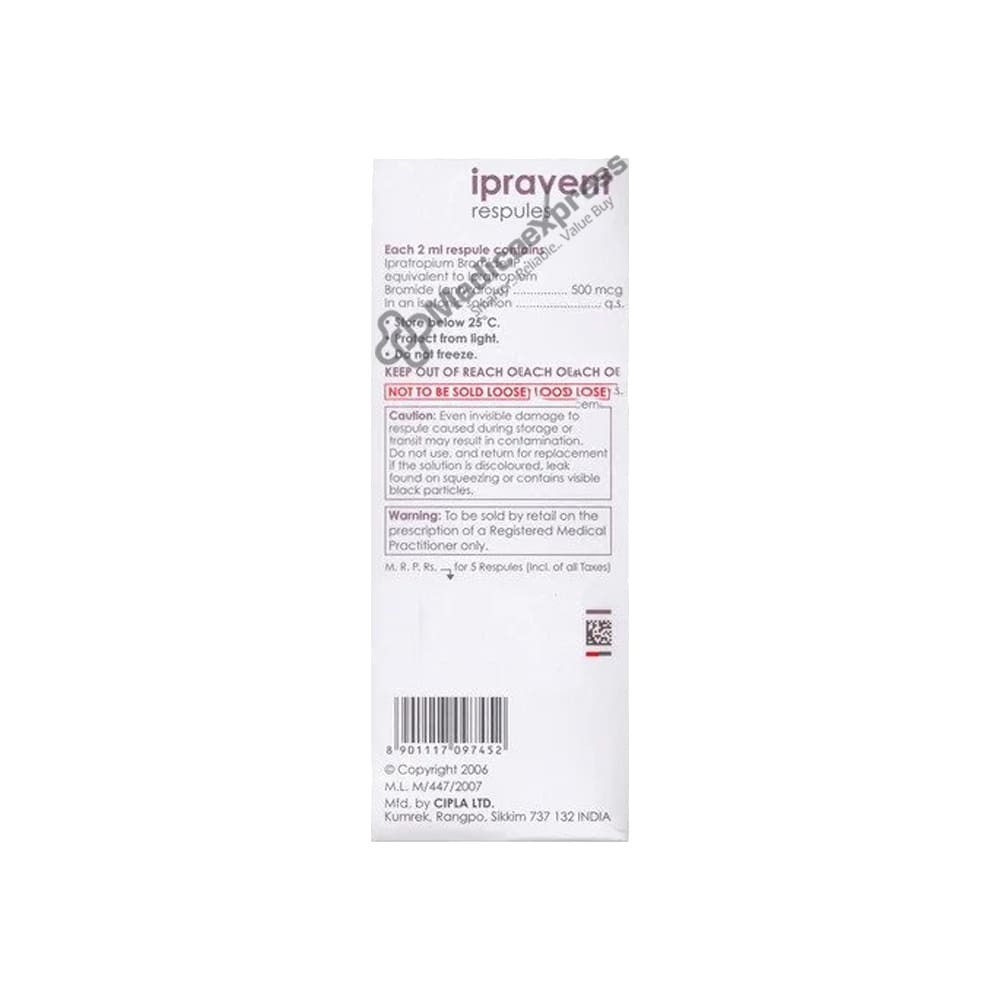 Ipravent Respules 5 x 2 ml is an anticholinergic medication that is used to treat asthma and chronic obstructive pulmonary disease (COPD). Asthma is a disease in which the airways narrow and swell, causing difficulty breathing, coughing, and wheezing (whistling sound).Disclaimer:For More Information Contact Your Physician