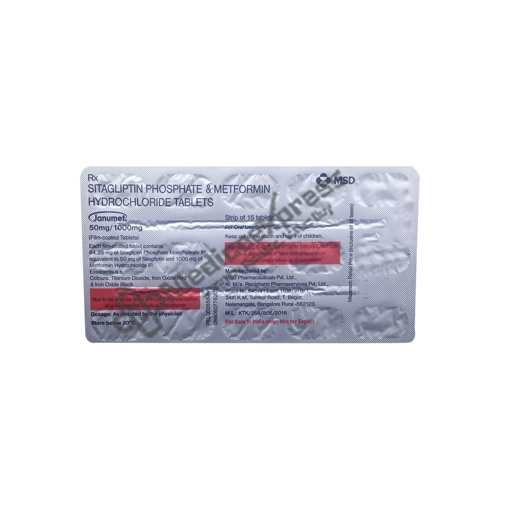 Janumet 50 Mg/1000 Mg Tablet 30's Is An Anti-Diabetic Combination Drug Of Sitagliptin (Dpp4 Inhibitors) And Metformin (Biguanides). Sitagliptin Is a Dipeptidyl Peptidase-4 (Dpp-4) Inhibitor That Works By Increasing The Amounts Of Certain Natural Substances That Lower Blood Sugar Levels When They Are High.Disclaimer:For More Information Contact Your Physician