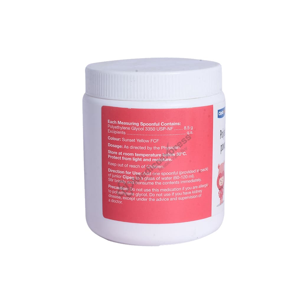 Junior Cipeg Powder 121.1 gm is an osmotic laxative, which is a type of medicine used to treat occasional constipation. Constipation is defined as infrequent bowel movements with stools that are frequently dry, hard, and painful to pass.Disclaimer:For More Information Contact Your Physician