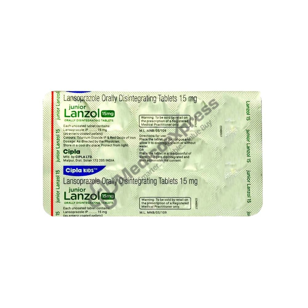 Junior Lanzol 15 mg Tablet 15 belongs to a class of antiulcer medications known as 'proton pump inhibitors,' which are used to treat stomach and intestinal ulcers, inflammation of the food pipe (oesophagus), gastro-oesophageal reflux disease - GERD (reflux of gastric contents into the oesophagus), heartburn, regurgitation, ulcers caused by pain relievers, infections caused by Helicobacter pyloriDisclaimer:For More Information Contact Your Physician