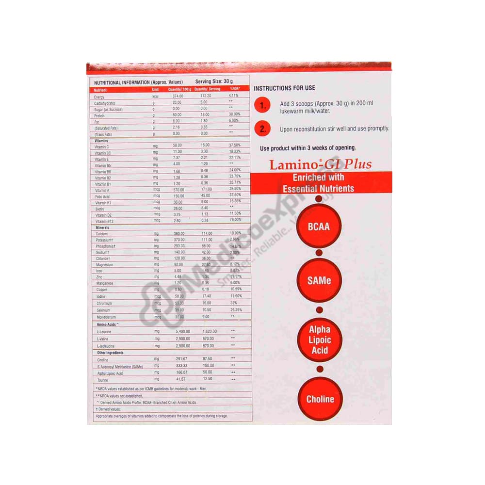 Lamino GI Powder 200gm is a one of a kind combination of SAMe, BCAA, Taurine, essential vitamins, and minerals that aid in the overall health of patients suffering from hepatic disorders.Disclaimer:For More Information Contact Your Physician