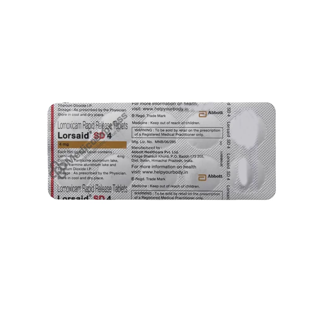 LORSAID SD 4MG TABLET contains Lornoxicam, a medication in the Nonsteroidal anti-inflammatory drug class (NSAIDs). It is used to treat symptoms such as pain and inflammation of joints associated with conditions such as rheumatoid arthritis (a chronic inflammatory condition affecting the joints) and osteoarthritis in the short term (type of arthritis that occurs when flexible tissue at the end of bones wears down).Disclaimer:For More Information Contact Your Physician