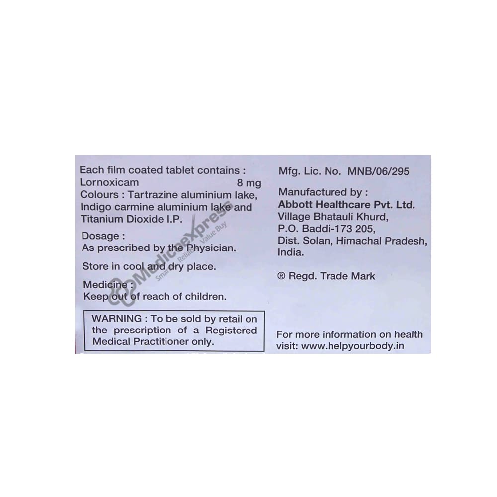 Lorsaid SD 8 Tablet 10 is an anti-rheumatic and anti-inflammatory agent that is used to reduce and relieve pain and inflammation (swelling) in osteoarthritis and rheumatoid arthritis. Osteoarthritis is a degenerative joint disease caused by the breakdown of a protective covering called cartilage.Disclaimer:For More Information Contact Your Physician