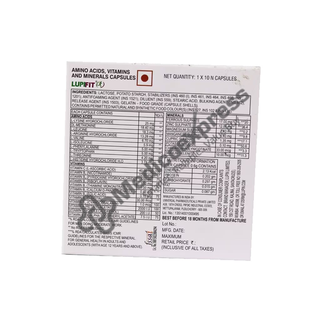 Lupifit capsule 10's contains vitamins, minerals, and amino acids that enhance general health and wellbeing. Vitamin and mineral deficiencies brought on by a lack of nutrient-rich food, malabsorption, or specific ailments are prevented or treated with it. It supports healthy blood formation, heart, neurological system, intestines, and vision maintenance. Patients with diabetes, cardiovascular conditions, arthritis, and varicose veins are advised to use it. Calcium shortage is treated with vitamin D3, which also aids in the body's normal absorption and utilisation of calcium. aids in stress management, muscle metabolism, and muscular tissue repair. increases muscle strength and physical performance while boosting the immune system. maintains the health of the skin, neurons, red blood cells, and bones.Disclaimer:For more information contact your physician.