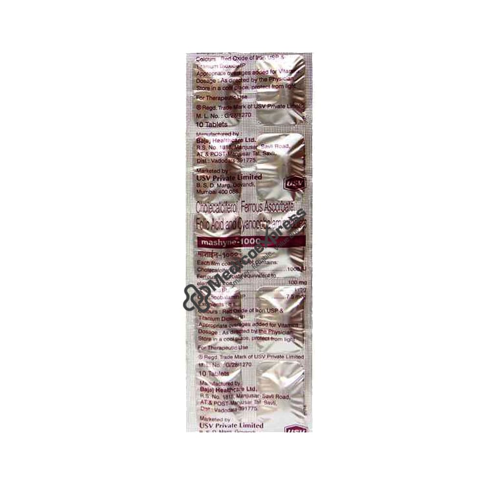 Mashyne -1000 Tablet contains iron, folic acid, cyanocobalamin, and cholecalciferol. Folic acid is required for many bodily functions, including nucleotide biosynthesis and homocysteine remethylation. It is especially important during periods of rapid cell division and growth.Disclaimer:For More Information Contact Your Physician