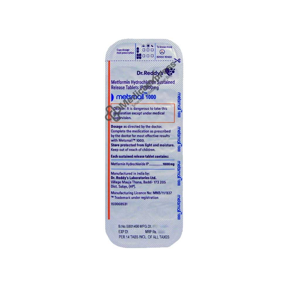 The Metsmall 1000 Mg Tablet 14s are a member of the biguanide class of anti-diabetic drugs used to treat diabetes. It aids people with type 2 diabetes in lowering their elevated blood glucose levels. Type 2 diabetes is a chronic or lifelong condition that interferes with how our bodies use glucose. In people with type 2 diabetes, either insufficient insulin is produced or the insulin that is produced is unable to work properly in the body (insulin resistance). Type 2 diabetes, often known as adult-onset diabetes, most frequently affects middle-aged or older people. When diet and exercise alone are unable to regulate blood sugar levels in people with type 2 diabetes, Metsmall 1000 Tablet 14s are given. It is the main kind of treatment.Disclaimer:For more information contact your physician.