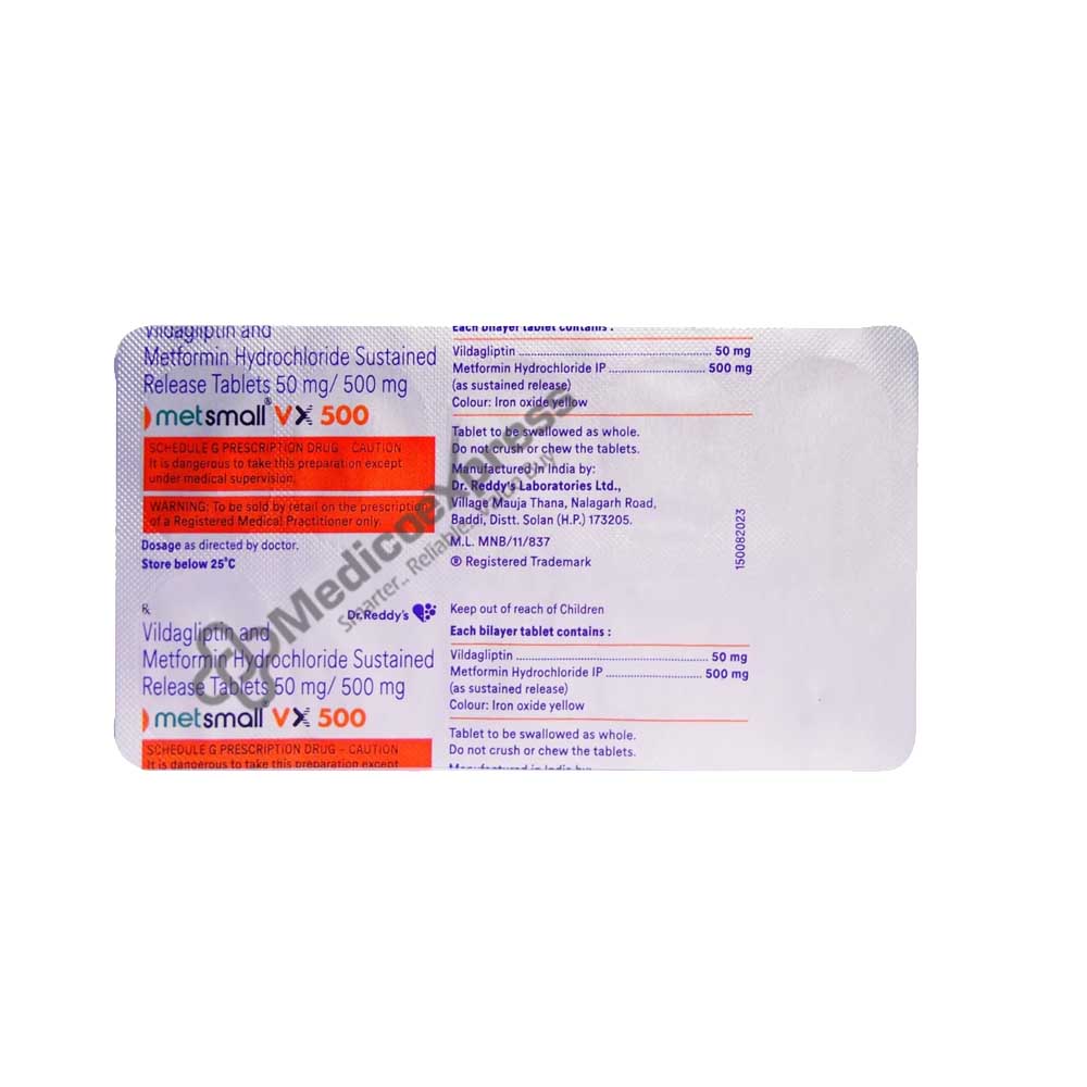 Metsmall VX 500 Tablet 10's contains Vildagliptin, a DPP-4 inhibitor, and metformin, a biguanide. NIDDM (non-insulin-dependent diabetes mellitus) or "maturity-onset diabetes" are the old names for type 2 diabetes. If the body doesn't create enough insulin or if the insulin it does produce isn't functioning as it should, type 2 diabetes can develop. Additionally, it may arise from an overabundance of glucagon in the body. Especially after meals, insulin is a chemical that helps lower blood sugar levels. Another chemical that causes the liver to produce more sugar and raise blood sugar levels is metsmall VX 500 Tablet 10s. Both these compounds are produced by the pancreas.Disclaimer:For more information contact your physician.