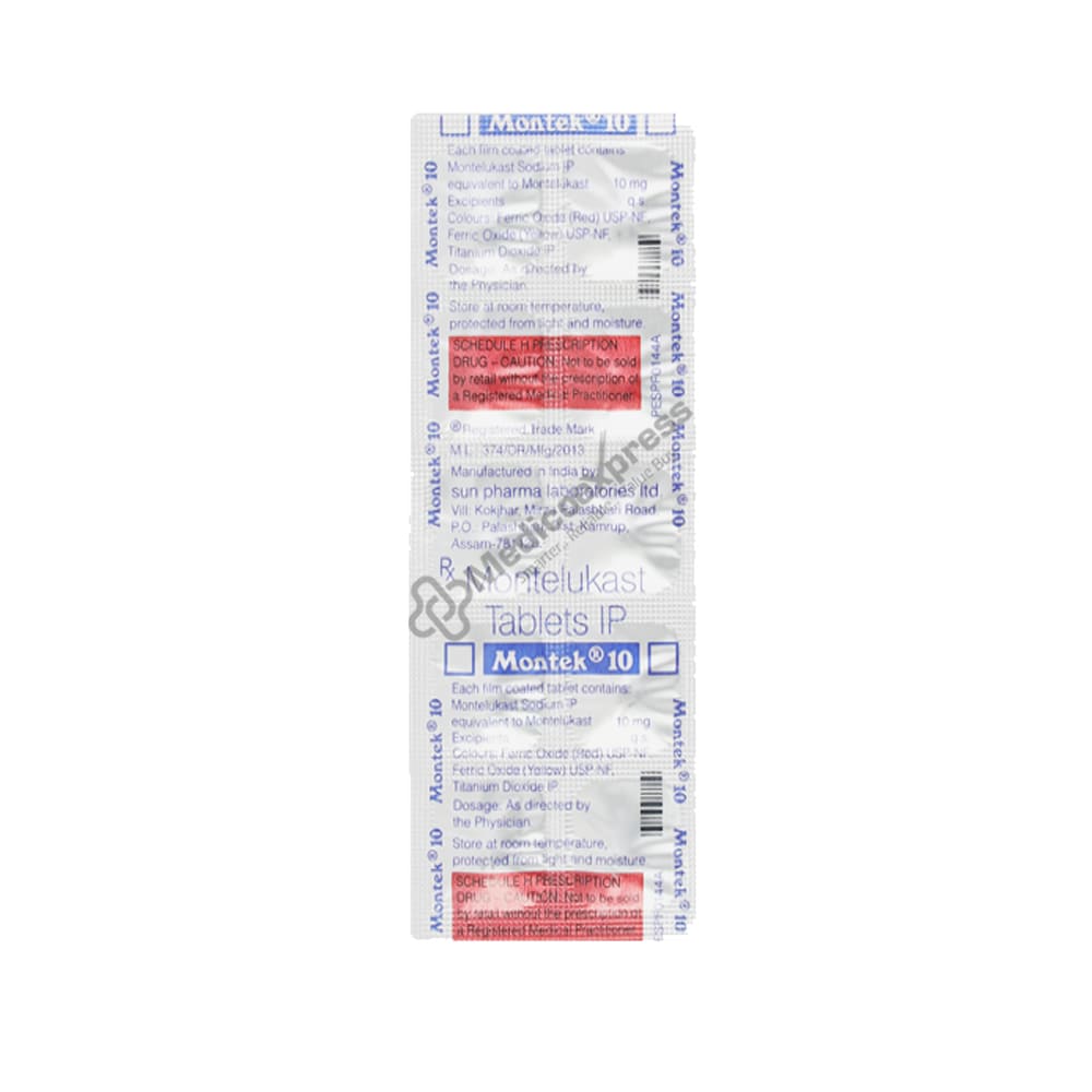MONTEK 10MG contains montelukast, a medication that belongs to a class of drugs known as leukotriene receptor antagonists (LTRAs). It may aid in the relief of asthma and allergic rhinitis symptoms. Asthma is a condition in which the lungs' airways narrow, swell, and produce extra mucus.Disclaimer:For More Information Contact Your Physician