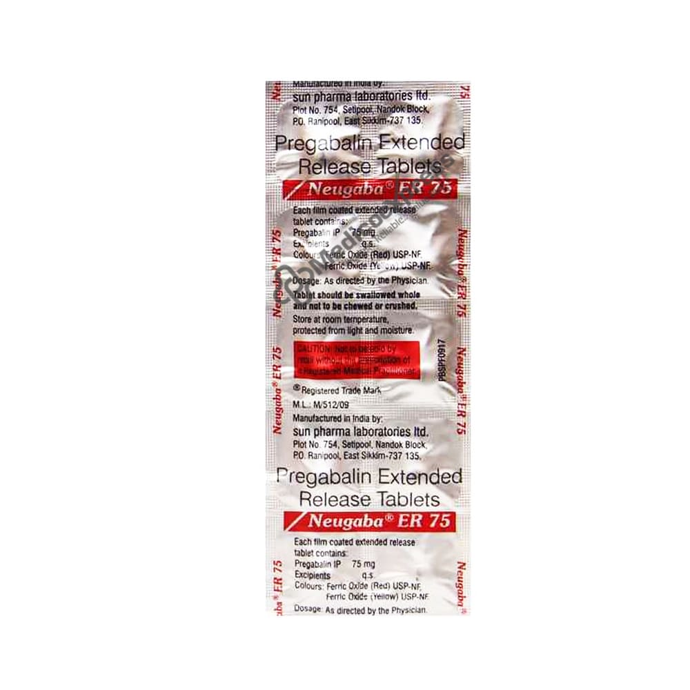 Neugaba ER 75 Tablet is a pain reliever used to treat neuropathic pain caused by diabetes, shingles (herpes zoster infection), spinal cord injury, or other conditions. It is also used to treat fibromyalgia patients' widespread muscle pain and stiffness.Disclaimer:For More Information Contact Your Physician