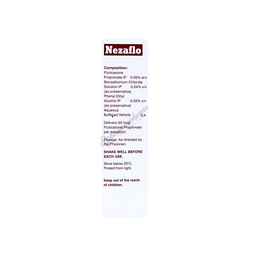 Nezaflo Nasal Spray contains steroids. It alleviates allergic rhinitis symptoms such as runny nose, sneezing, and sinus discomfort. It works by inhibiting the production of certain chemical messengers that cause inlammation (swelling) and allergies, thereby alleviating nasal discomfort and irritation.Disclaimer:For More Information Contact Your Physician