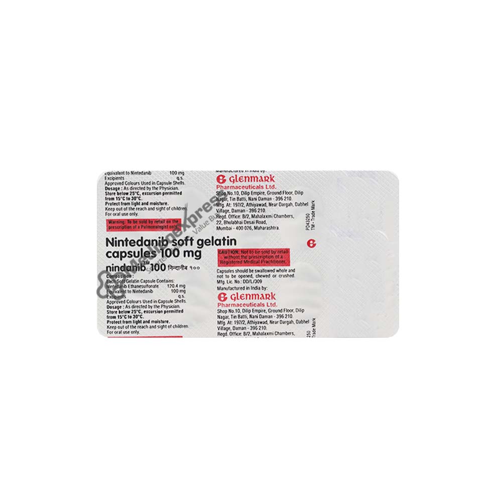 Nindanib 100 mg Capsule 10's are primarily used to treat individuals with idiopathic pulmonary fibrosis (IPF). Lung function gradually deteriorates as a result of the irreversible disease known as IPF. Over time, the lungs' tissues swell and scar, making it more challenging to take deep breaths. The scarring hinders the lungs' ability to function correctly. By reducing the release/activity of naturally existing growth factors in the body, the drug "Nintedanib" included in Nindanib 100 Soft Gelatin Capsule 10s helps minimise scarring and swelling in the lungs and improves breathing. Idiopathic pulmonary fibrosis is slowed down by taking 10 nindanib 100 Soft Gelatin Capsules.Disclaimer:For more information contact your physician.