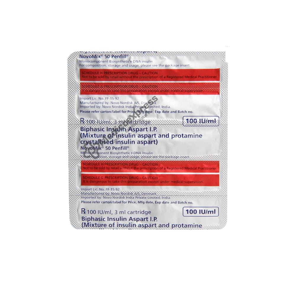 Novomix 50 100IU/ml Penfill 3ml is a medication that treats diabetes mellitus in adults and children (over the age of two) by combining human insulin with a longer-acting insulin analogue. Both adults and children's blood sugar levels are maintained by it. The condition known as diabetes mellitus affects how your body uses glucose.Disclaimer : For More Details, Contact Your Physician