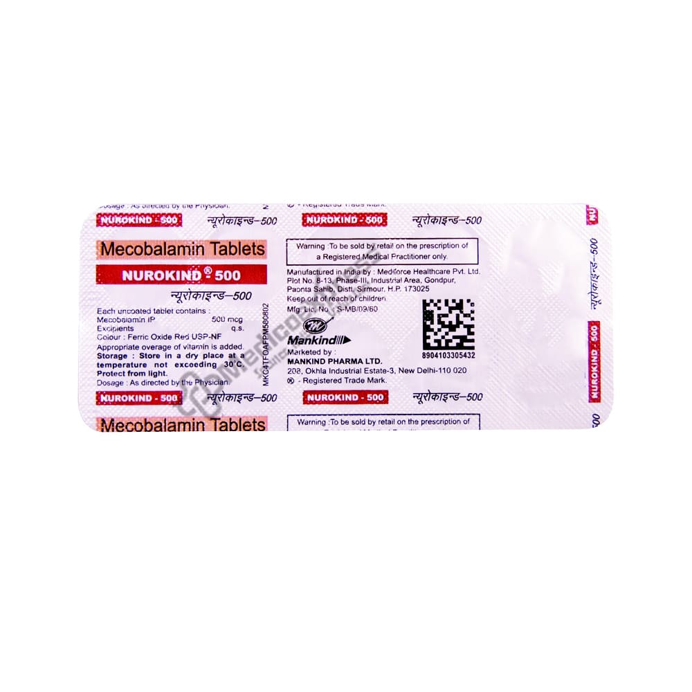 Nurokind 500 mg Tablet 10's contains Methylcobalamin. To prevent and treat low vitamin B12 levels, methylcobalamin is employed. Anemia and harm to the nervous system can result from vitamin B12 deficiency. Diabetic neuropathy and peripheral neuropathy are both treated with it. It is an important ingredient that aids in the body's production of healthy neuron and red blood cells. Protein transport in nerve cells in diabetics is restored to normal by methylcobalamin. As a result of drug-induced neuropathies, it shows inhibitory effects on neuron degeneration. Because it participates in the transmethylation reaction, methylcobalamin speeds up the metabolism of lipids, proteins, and nucleic acids. As a result, it has a regenerative effect on damaged nerve tissues. Methylcobalamin is clinically beneficial and successful for the treatment of paralysis, numbness, and pain brought on by peripheral neuropathies.Disclaimer:For more information contact your physician.