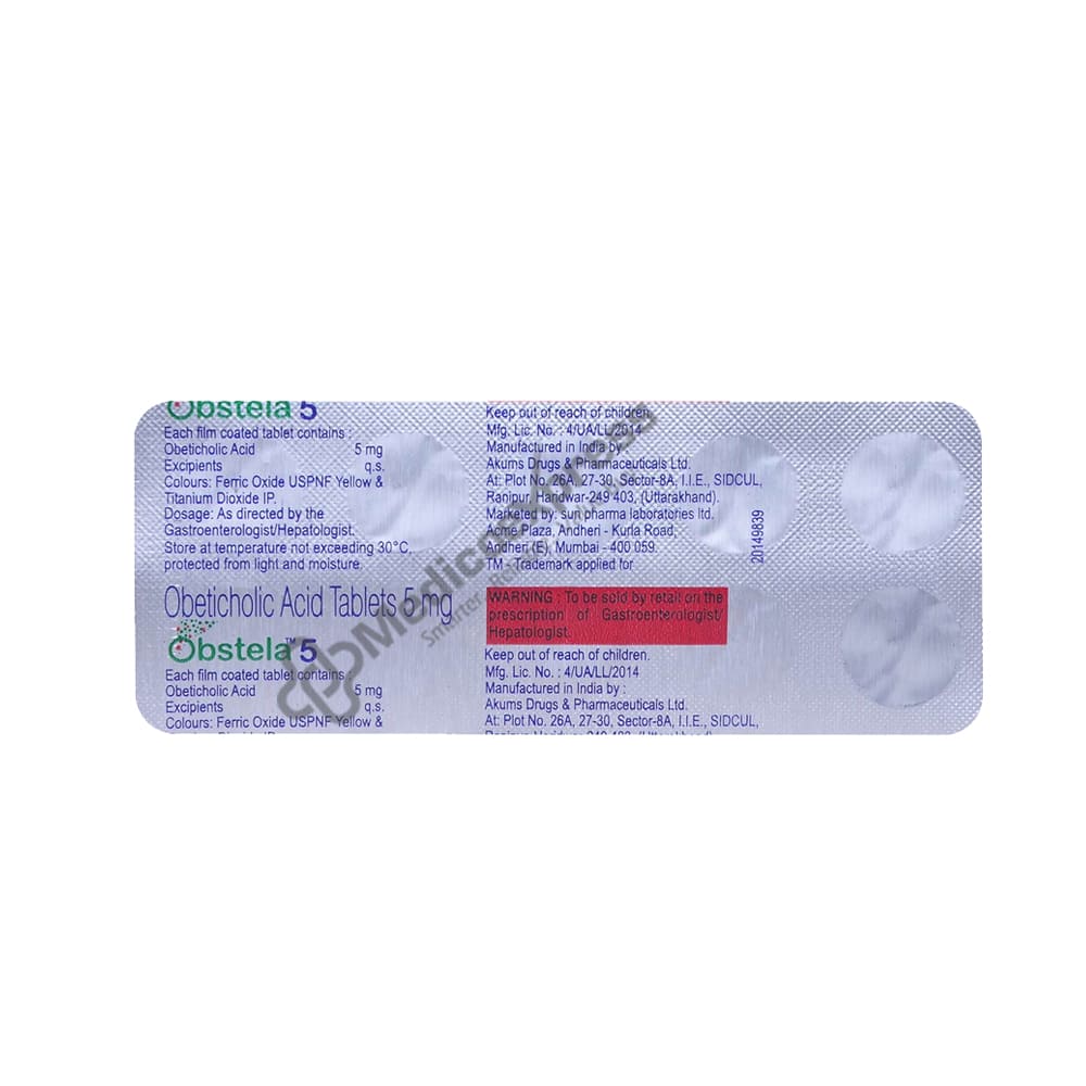 Obstela 5mg Tablet is used to treat primary biliary cirrhosis, either alone or in combination with other medications. It improves liver function by inhibiting bile acid production and increasing bile acid removal from the liver. This reduces bile acid in the liver, preventing its toxic effects.Disclaimer:For More Information Contact Your Physician