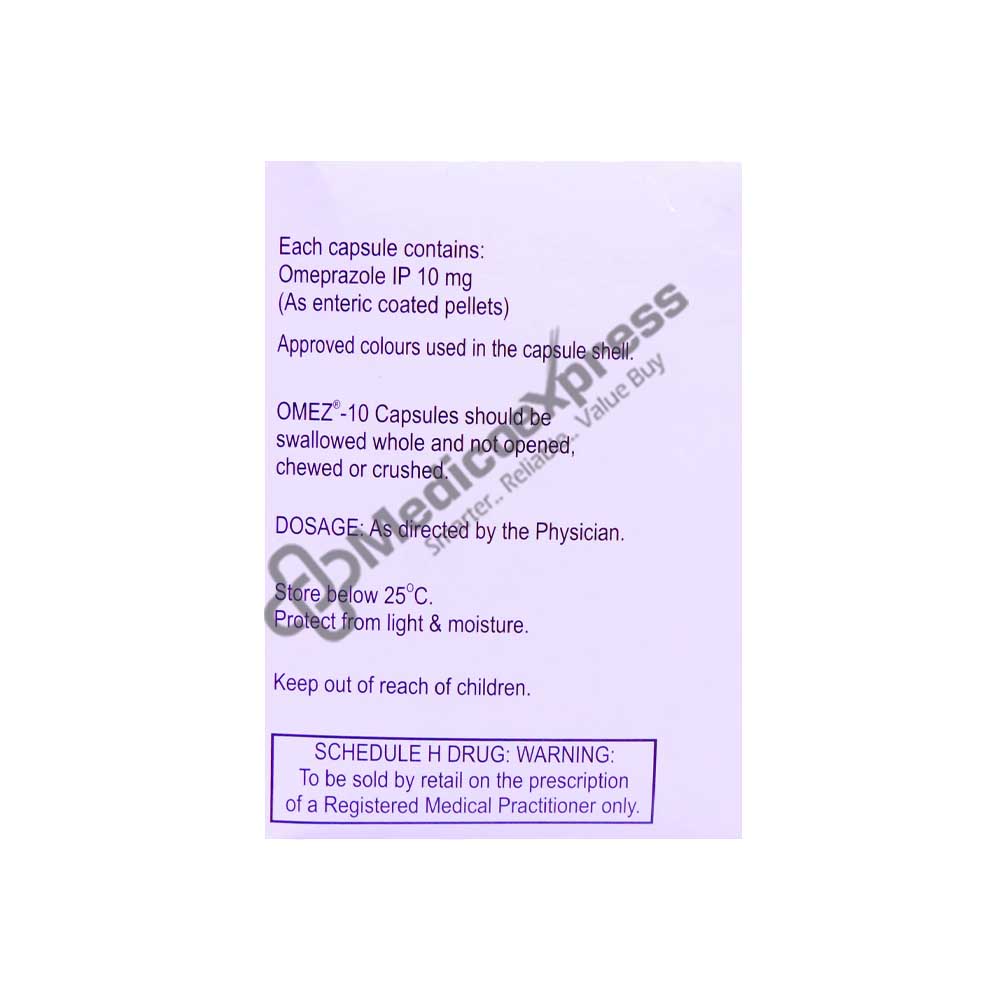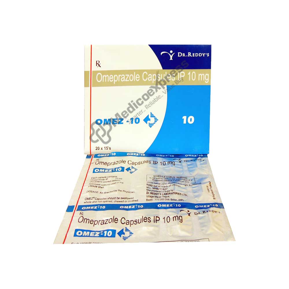 Omez 10 Mg Capsule 15s are part of a group of medications called proton pump inhibitors (PPIs), which lessen the amount of acid your stomach produces. It treats stomach ulcer, Zollinger Ellison syndrome, and gastroesophageal reflux disease (GERD) (overproduction of acid due to pancreatic tumour).Omez 10 Mg Capsule 15s contain omeprazole, which works by inhibiting an enzyme (gastric proton pump or H+/K+ ATPase) to lower stomach acid. This proton pump, which is located in the stomach wall cells, is in charge of secreting gastric acid. Omez 10 Capsule 15's reduce the symptoms of gastroesophageal reflux disease (GERD) or heartburn by stopping the production of stomach acid and esophagitis.Disclaimer:For more information contact your physician.