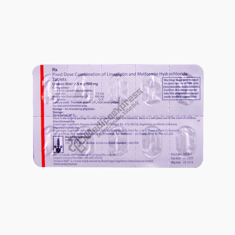 ONDERO MET 2.5/500MG Tablet 10 consists of Linagliptin (DPP4 inhibitors) and Metformin (Biguanide).Disclaimer:For More Information Contact Your Physician