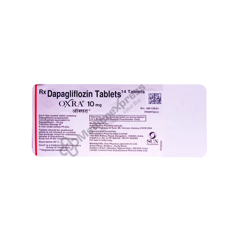 OXRA 10MG contains Dapagliflozin, a medication that belongs to a class of drugs known as sodium-glucose co-transporter 2 (SGLT2) inhibitors. It is used to treat type 2 diabetes and to lower the risk of cardiovascular disease.Disclaimer:For More Information Contact Your Physician