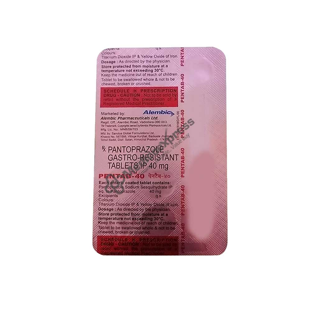 Pentab-40 Tablet 10 belongs to the Proton pump inhibitor class of drugs, which reduces the amount of acid produced by your stomach. It is used to treat gastroesophageal reflux disease (GERD), stomach ulcers, Zollinger Ellison syndrome (pancreatic tumor-induced acid overproduction), duodenal ulcers, gastric ulcers, and Crohn's disease-associated ulcers.Disclaimer:For More Information Contact Your Physician