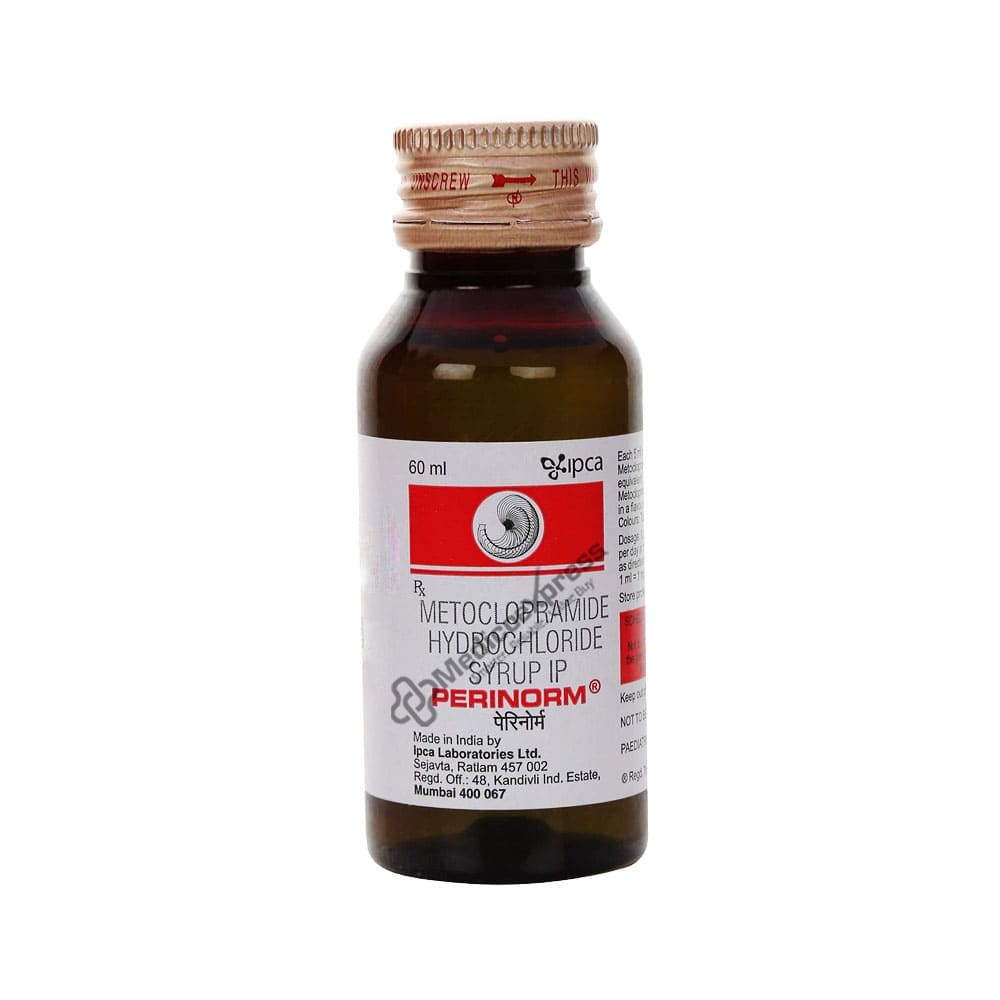 Perinorm syrup 60 ml is an anti-emetic medication that is used to prevent nausea and vomiting caused by chemotherapy, radiotherapy, and migraine.Disclaimer:For more information contact your physician