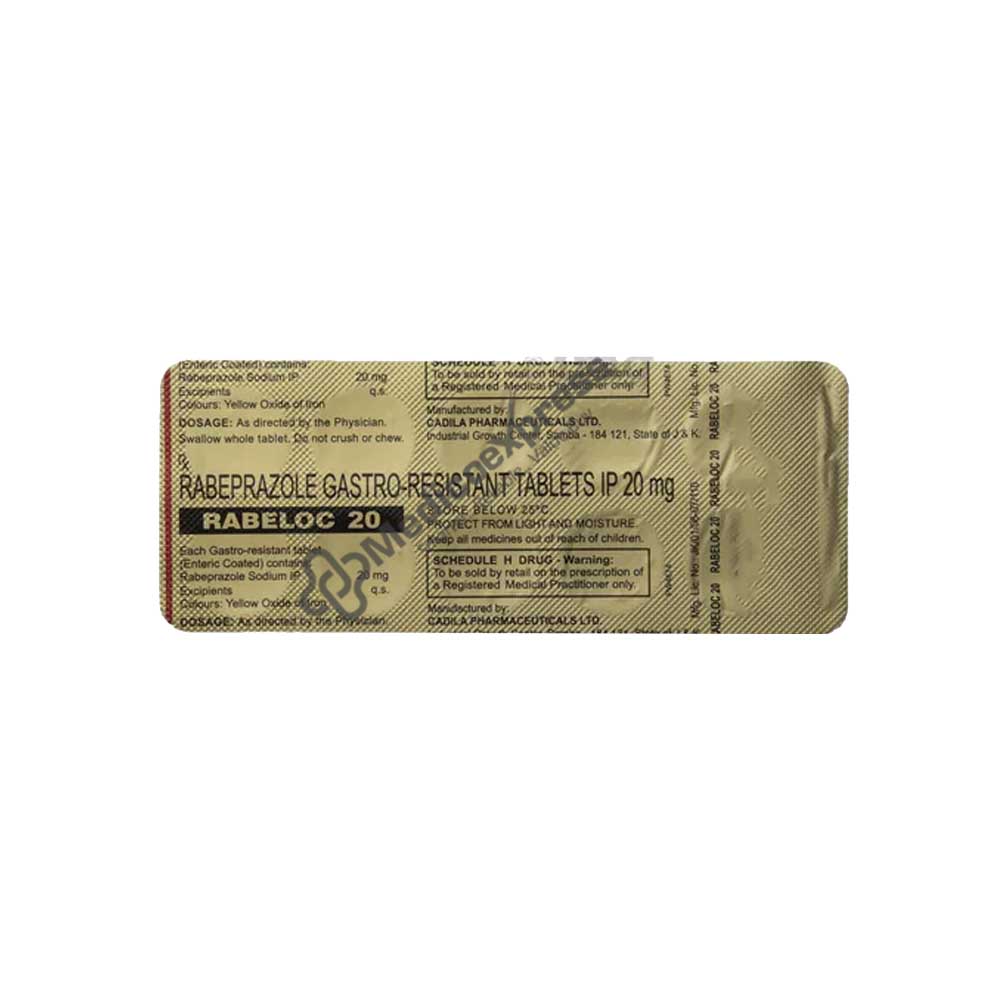 Rabeloc 20mg Tablet 10'S, is a member of the class of drugs known as proton pump inhibitors. It is used to treat Zollinger-Ellison syndrome, peptic ulcers, and gastroesophageal reflux disease (GERD) (tumours in the pancreas causing the stomach to secrete more acid). A persistent digestive condition known as GERD occurs when stomach acid repeatedly leaks into the oesophagus, irritating the lining of the food pipe. Heartburn, chest pain, nausea, a lump in the throat sensation, and stomach discomfort are among the symptoms. Peptic ulcers are uncomfortable sores that form on the stomach, oesophagus, and/or intestines' linings. Stomach ache, flatulence, indigestion, vomiting, and exhaustion are among the symptoms. Preferably take Rabeloc 20mg Tablet 10'S before meals, or as prescribed by a doctor. Tell your doctor if you have any allergies before using Rabeloc 20mg Tablet 10'S.Disclaimer:For more information contact your physician.