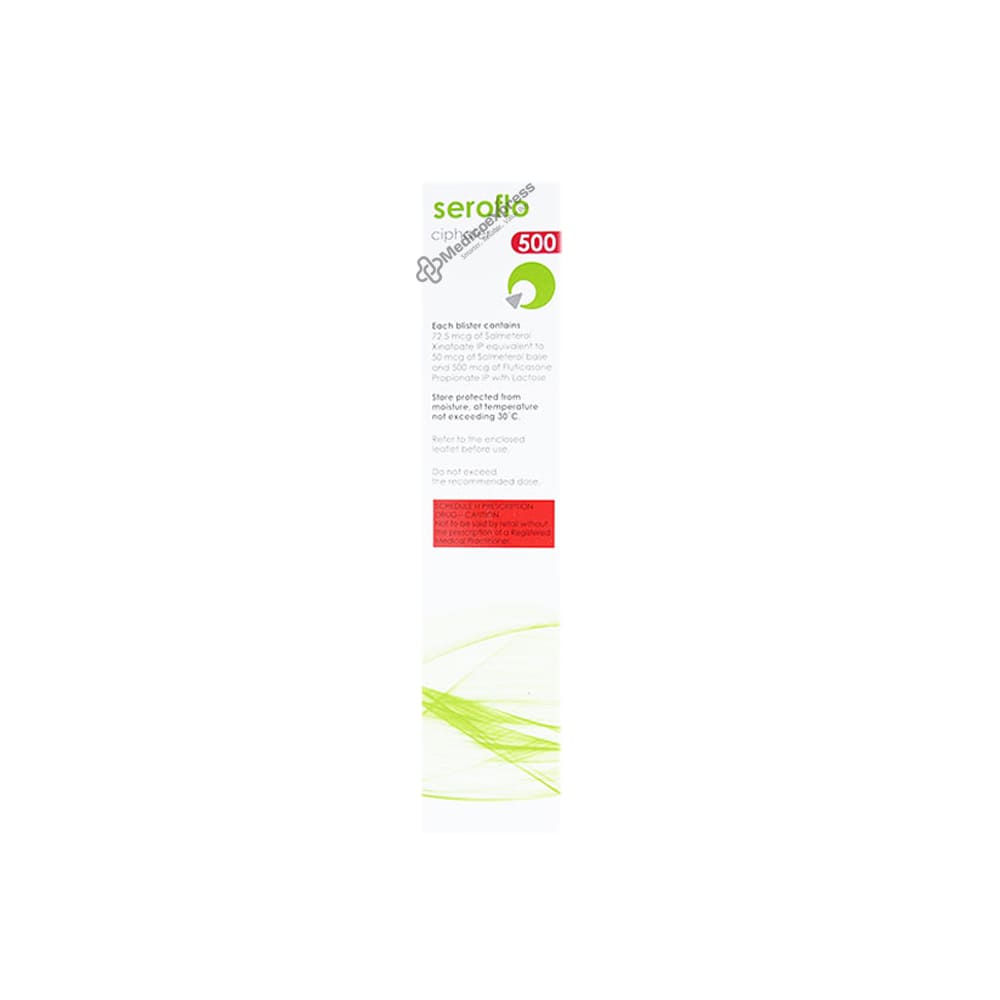 Seroflo 500 Ciphaler 60 Doses is a respiratory medication used to treat and prevent asthma as well as chronic obstructive pulmonary diseases (COPD) such as bronchitis (inflammation of the lining of your bronchial tubes) and emphysema (shortness of breath).Disclaimer:For More Information Contact Your Physician