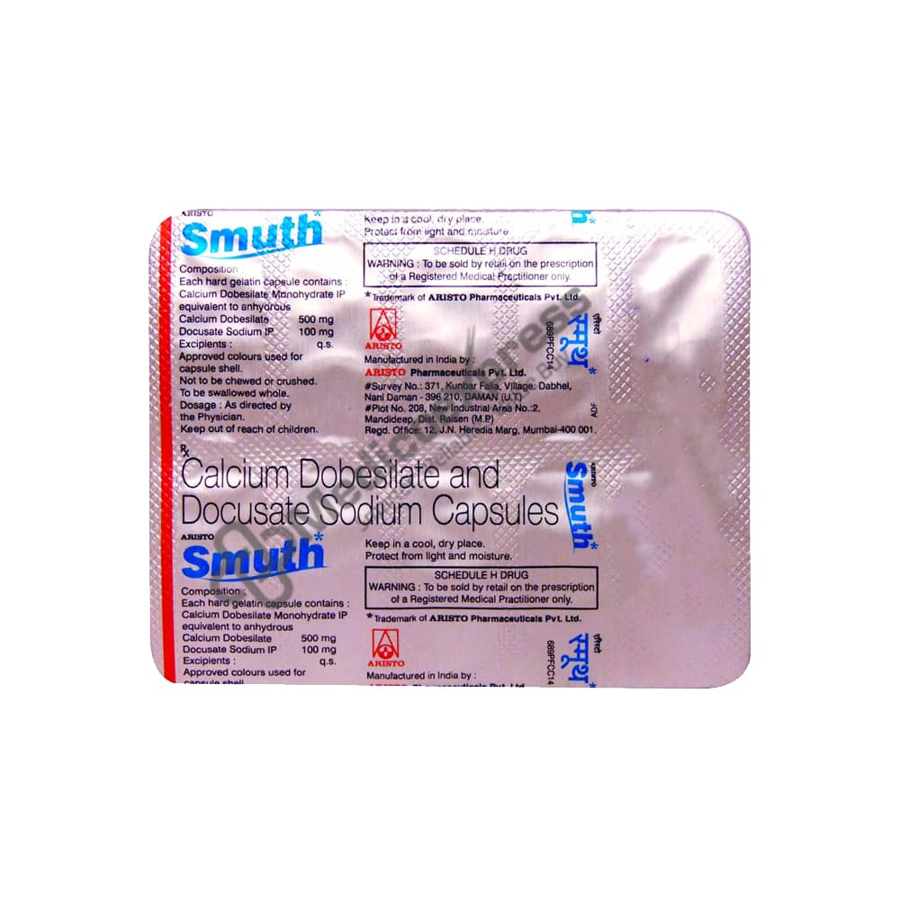 SMUTH CAPSULE is a mixture of Calcium dobesilate and Docusate sodium, both of which are Vasoprotectives and Laxatives, respectively. It is used to treat constipation (difficulty and less frequent bowel motions), and it also aids in the transit of stool in people with piles (haemorrhoids).Disclaimer : For More Details, Contact Your Physician