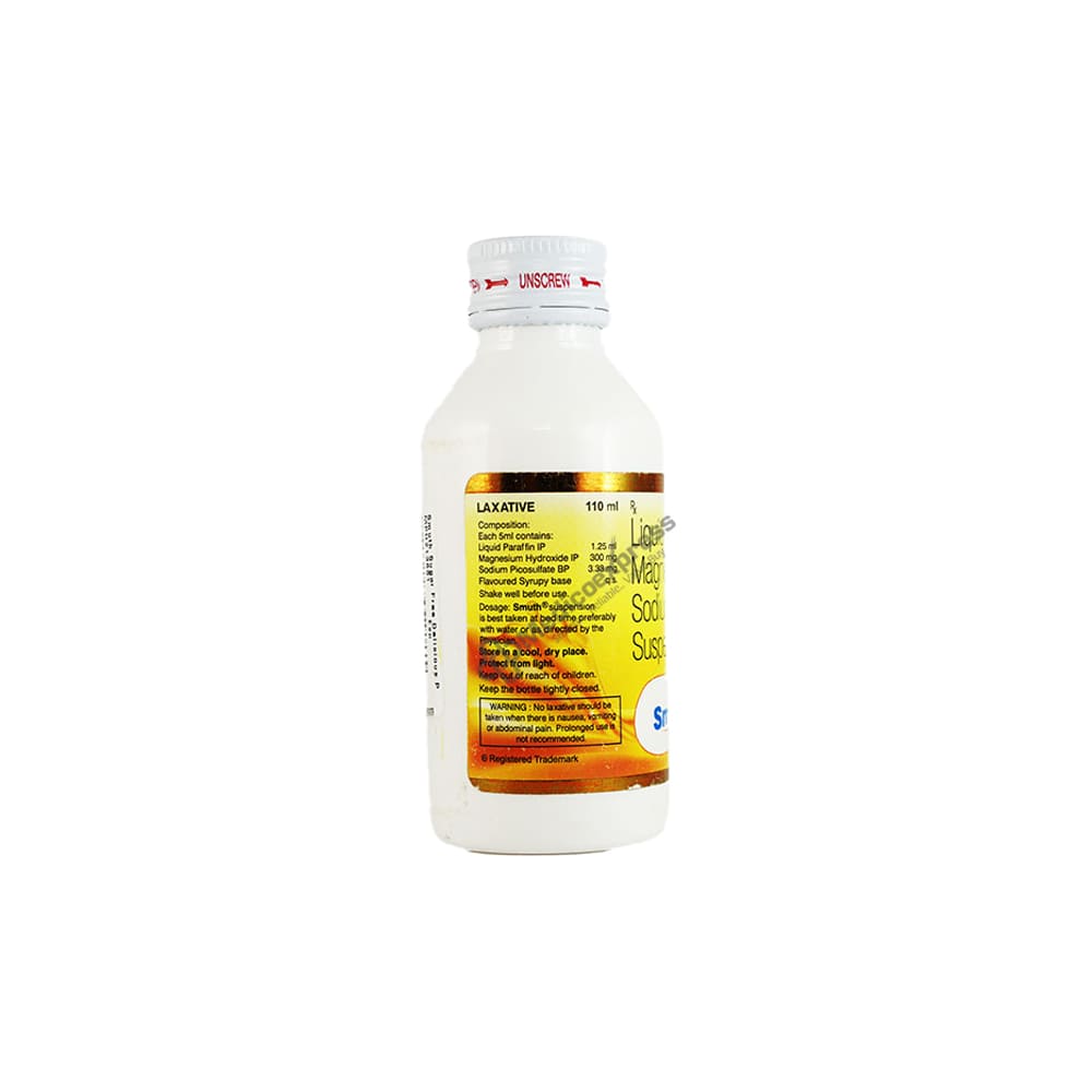 Smuth Syrup 110 ml is a laxative that is used to treat constipation caused by piles, anal fissure, hernia, cardiovascular disease, endoscopy, bowel clearance before radioscopy, pre/post-operative conditions, elderly, and bed-ridden patients. Constipation is defined as infrequent bowel movements with stools that are frequently dry, painful, and difficult to pass.Disclaimer : For More Details, Contact Your Physician