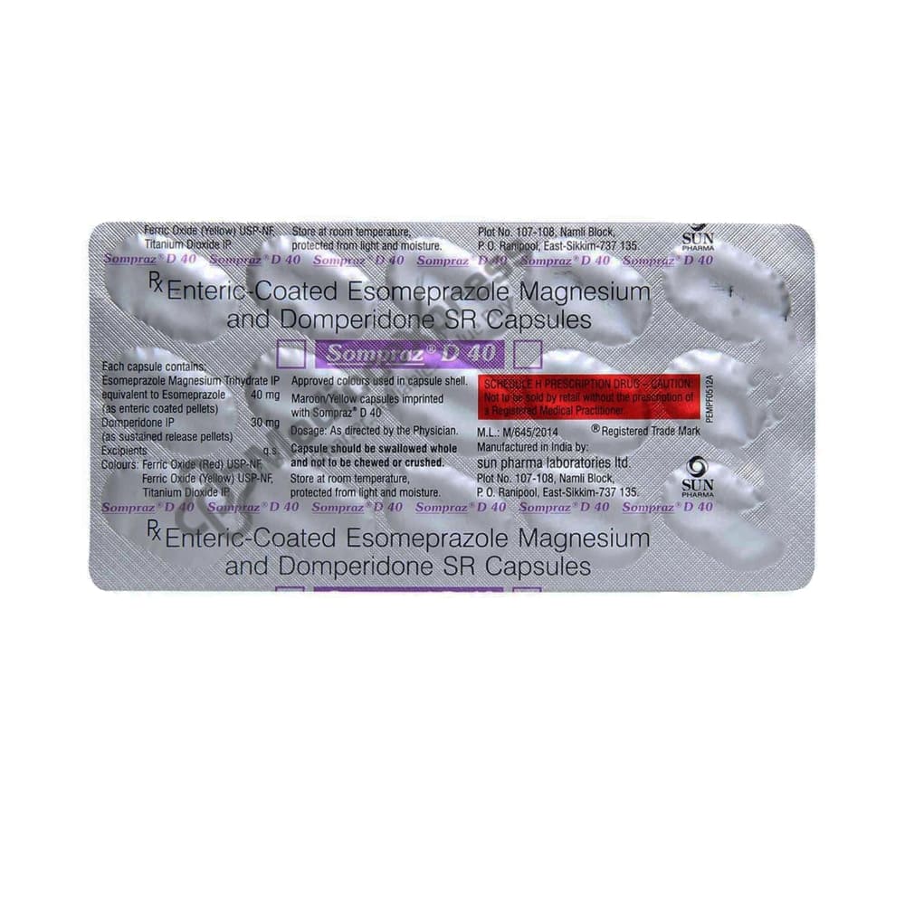 Sompraz D 40 Capsule 15's a Gastrointestinal Agent That Is Used To Treat Acid Reflux, Heartburn, Gastroesophageal Reflux Disease (Gerd), Zollinger-Ellison Syndrome, Nausea, Vomiting, Dyspepsia (Indigestion), Epigastric Pain, Peptic Ulcers, And Helicobacter Pylori Infection.Disclaimer:For More Information Contact Your Physician