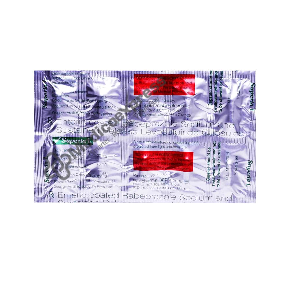 Superia L Capsule 10's are gastrointestinal agents that are used to treat gastro-oesophageal reflux disease (GERD), acidity, heartburn, Zollinger-Ellison syndrome, Helicobacter pylori infection, irritable bowel syndrome, indigestion, duodenal and gastric ulcers.Disclaimer:For More Information Contact Your Physician