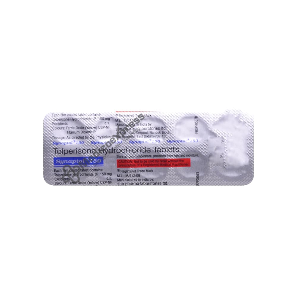 Synaptol 150 Tablet 10 is a medication that belongs to a class of drugs known as centrally acting muscle relaxants. It was previously used to treat acute musculoskeletal pain (pain within the body starts from muscles, bones, or joints).Disclaimer:For More Information Contact Your Physician