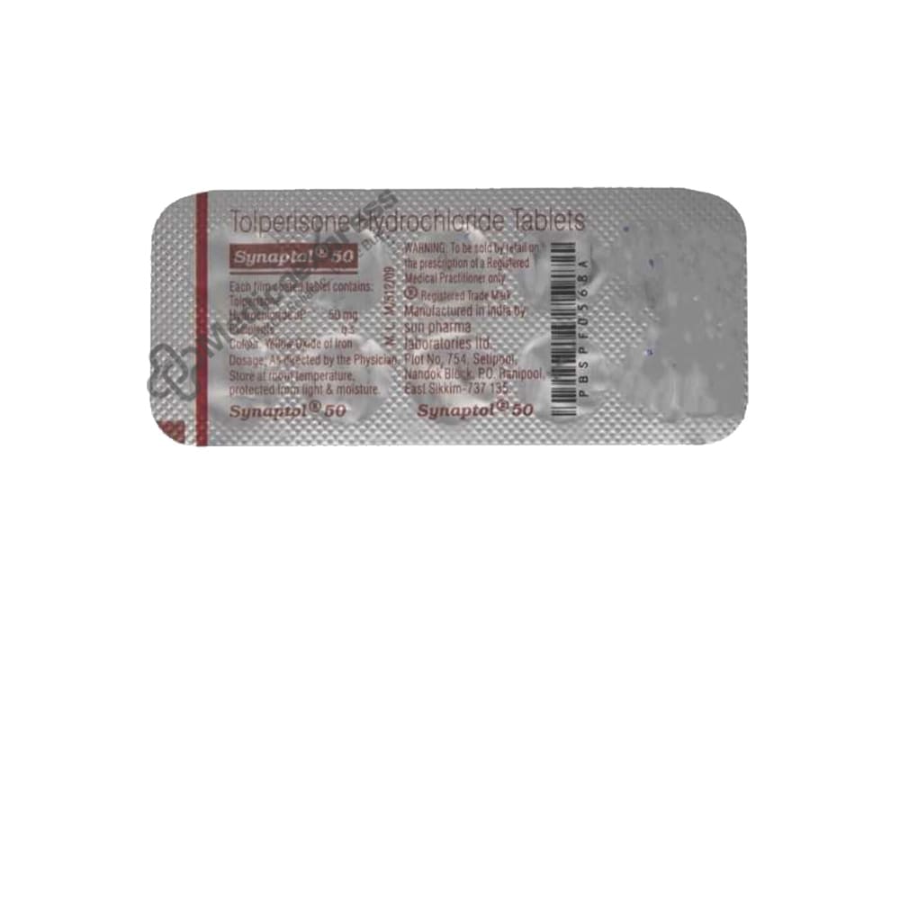 SYNAPTOL 50MG TABLET is a medication in the class of centrally acting muscle relaxants. SYNAPTOL 50MG TABLET is a medication used to treat acute musculoskeletal pain (pain within the body starts from muscles, bones, or joints).Disclaimer:For More Information Contact Your Physician